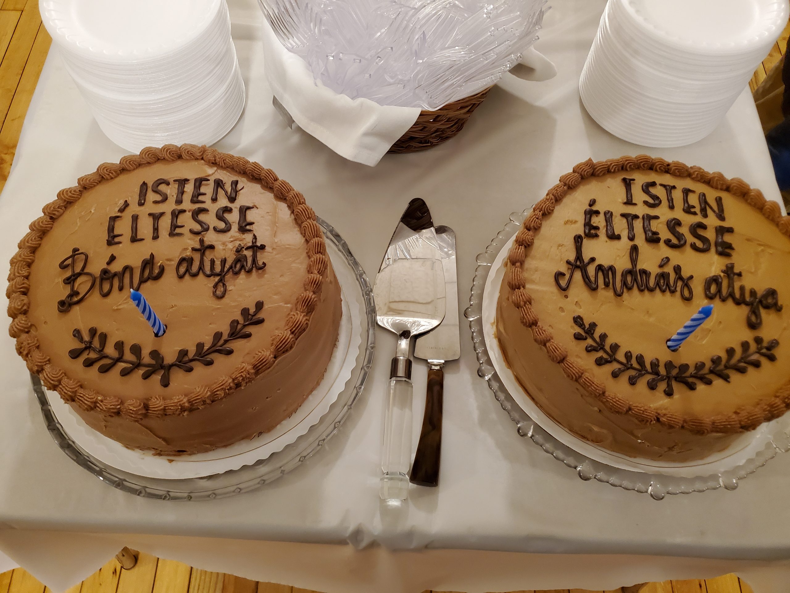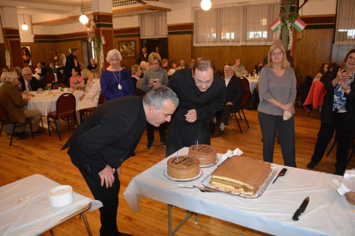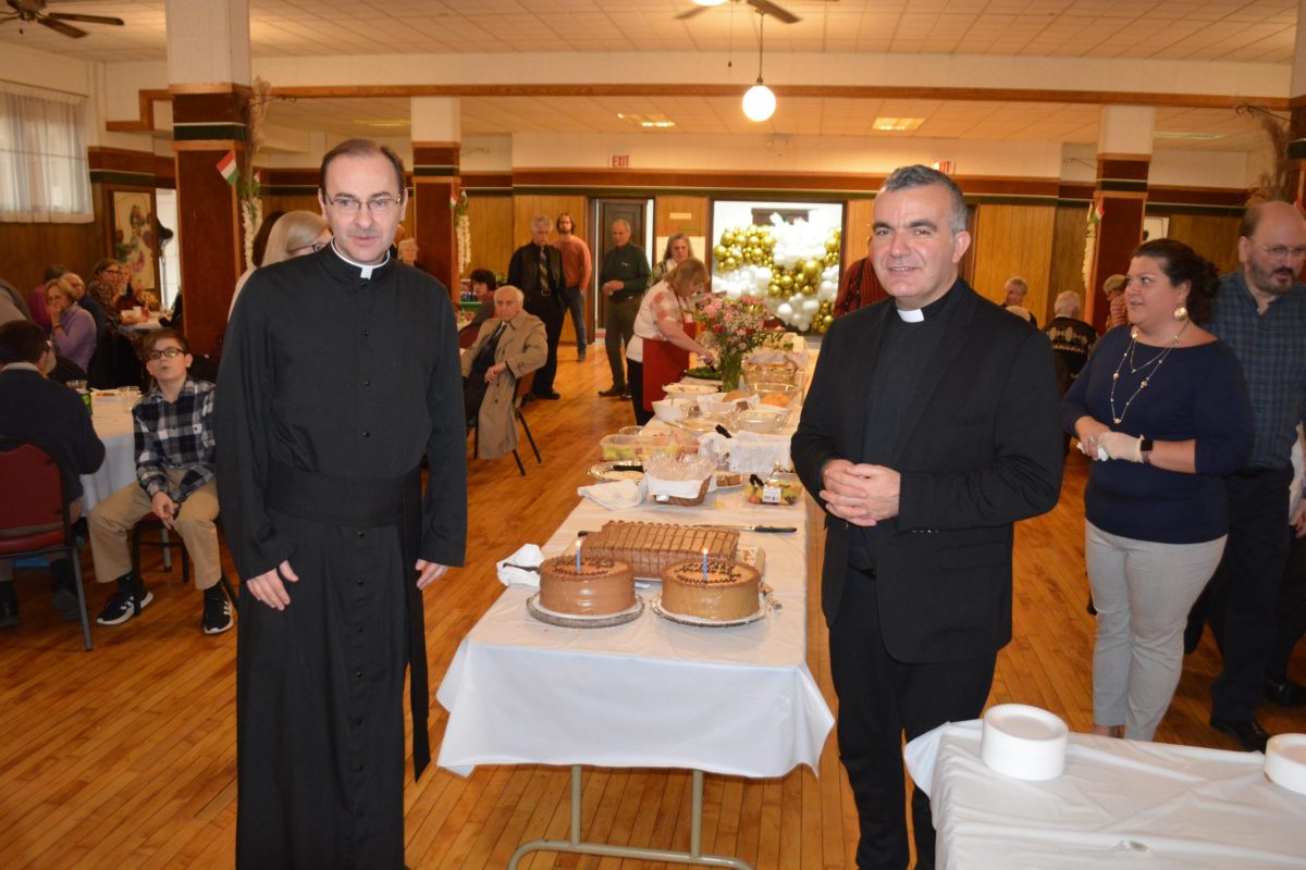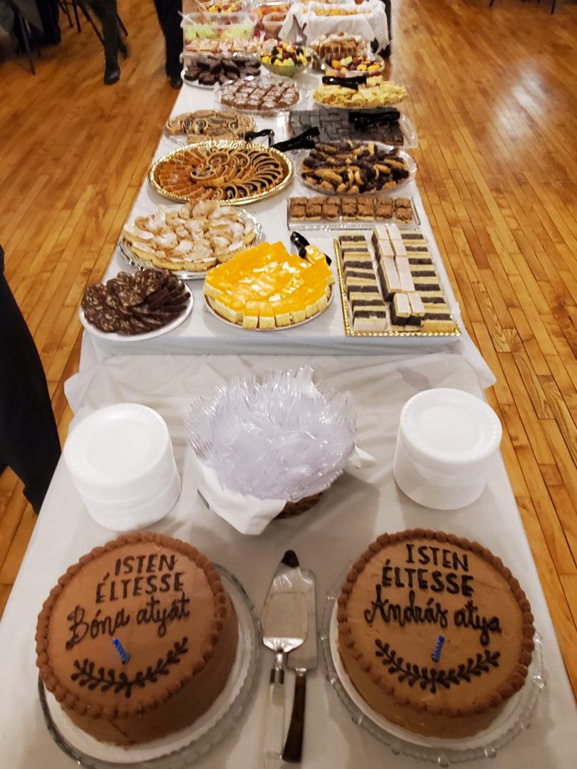 Father András Mezei, pastor of the Little Saint Teresa Carmelite Basilica in Keszthely, Hungary, who was the administrator of St. Emeric Church from 2015 to 2020, visited us on November 26, 2023, and to our great joy celebrated Mass with us once again. After the mass, we held a reception in the church hall where we celebrated the birthdays of Fr. Mezei and our pastor Father Bona.