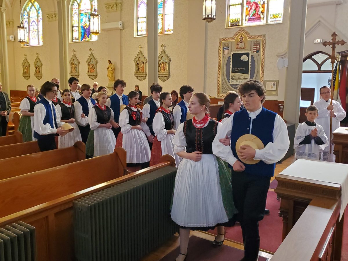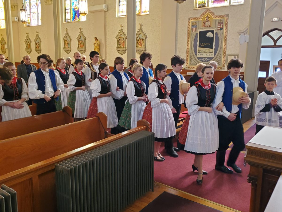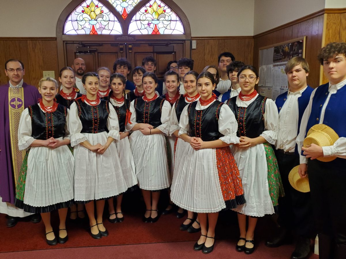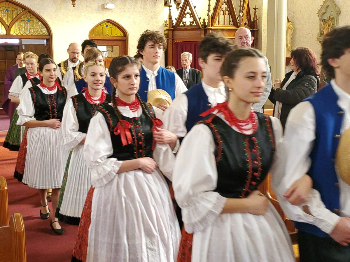 A clevelandi magyar cserkész Regös Csoport 21 tagja a regös hétvége alatt, mindenki örömére, magyar népviseletekben vettek részt a Szt. Imre templom szentmiséjén 2023. már. 5-én.