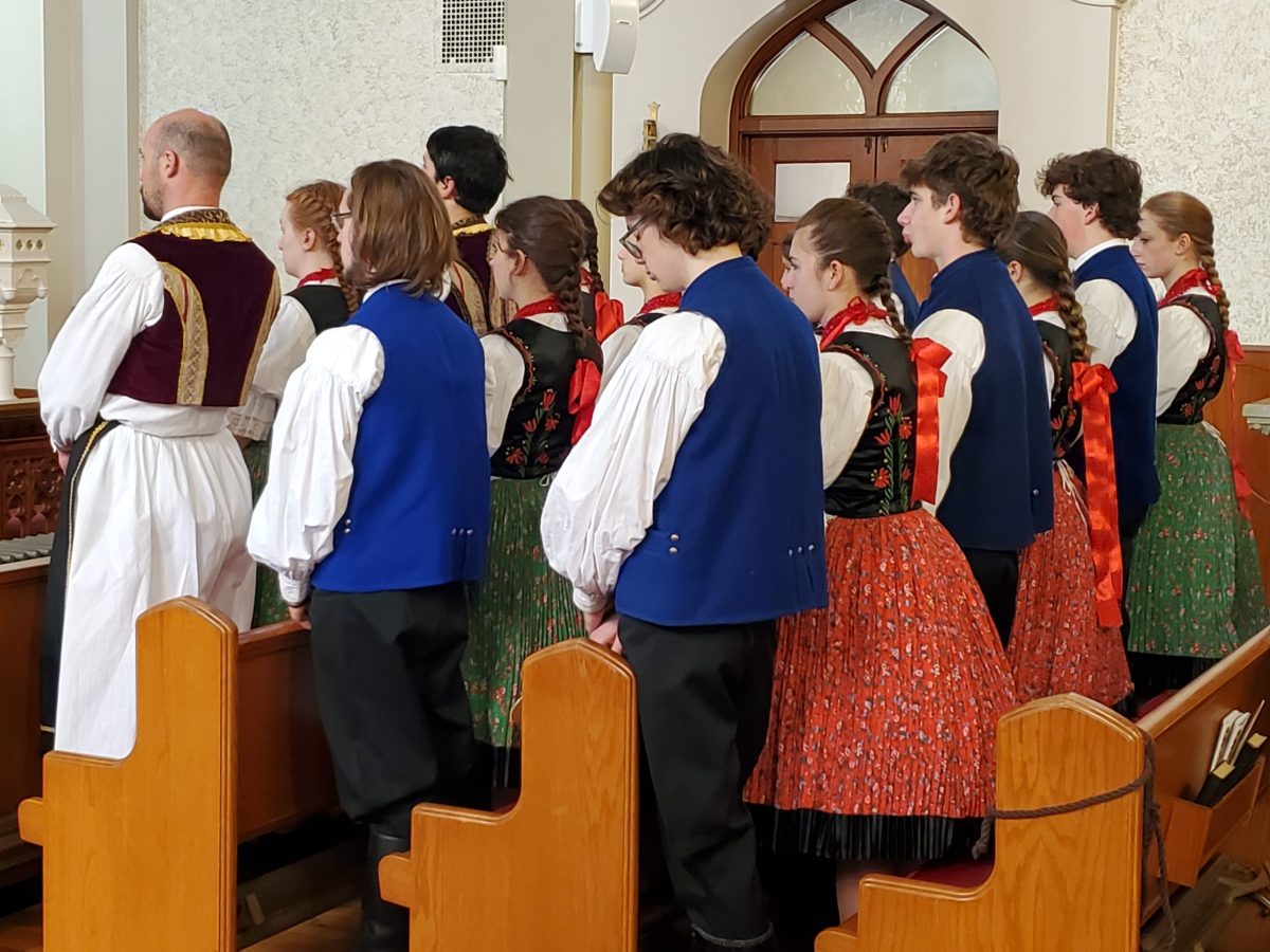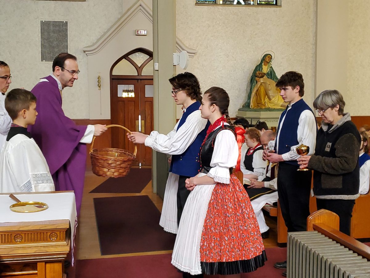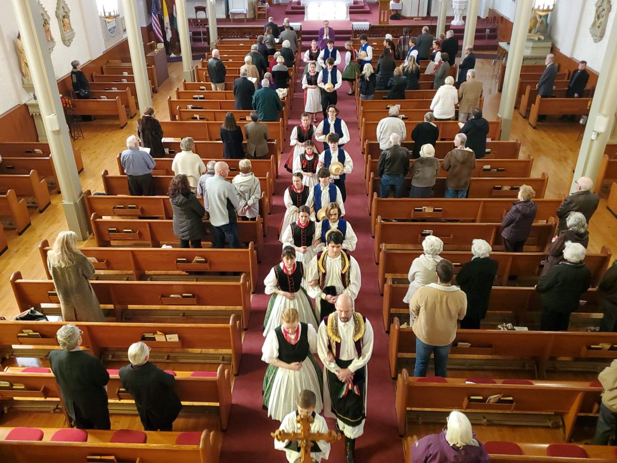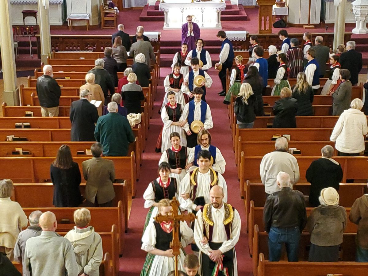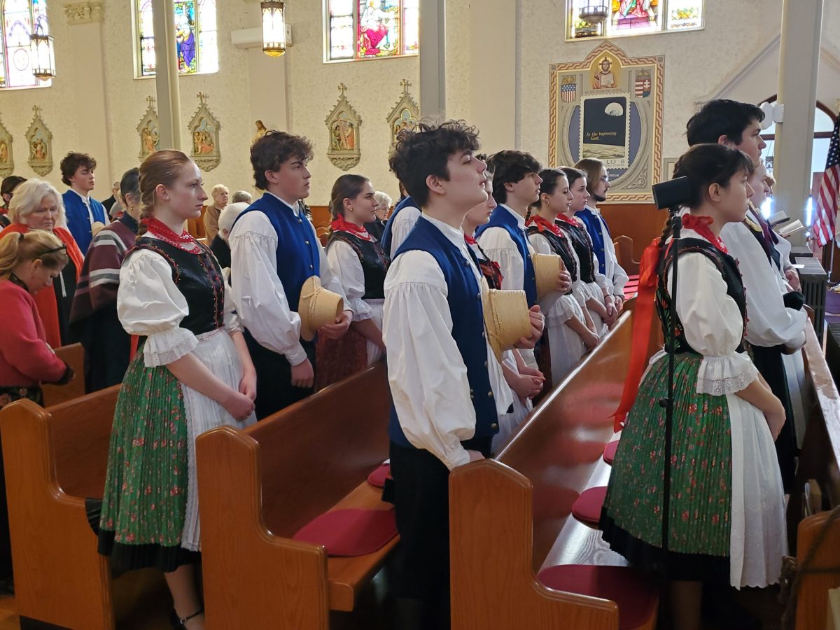 A clevelandi magyar cserkész Regös Csoport 21 tagja a regös hétvége alatt, mindenki örömére, magyar népviseletekben vettek részt a Szt. Imre templom szentmiséjén 2023. már. 5-én.