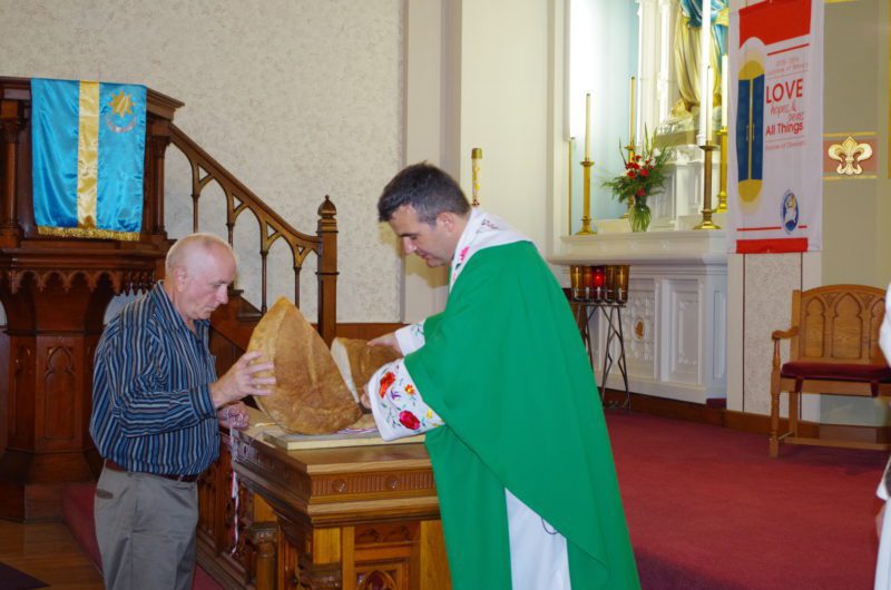 Mezősi Lajos, tasnádi születésű pékmester egy óriási nagy kenyérrel ajándékozta meg közösségünket, amelynek szimbolikus üzenete van. Mint ahogyan Jézus megajándékoz bennünket az élet kenyerével, ezt az ajándékozást nekünk is tovább kell adnunk. Természetesen nem feledkezhetünk meg a hálaadásról sem, hiszen ilyenkor szoktak az új búzából kenyeret sütni. Mindenkinek jutott egy kis darab kenyér, amelyhez volt egyéb finomság is a diszterműnkben, ahol az együttlétet folytattunk. Szokás a külhoni magyaroknál, hogy szentmise után tartanak szerény agapékat, amelynek célja nem az eszem-iszom, hanem a közösség összetartása és megmaradása.