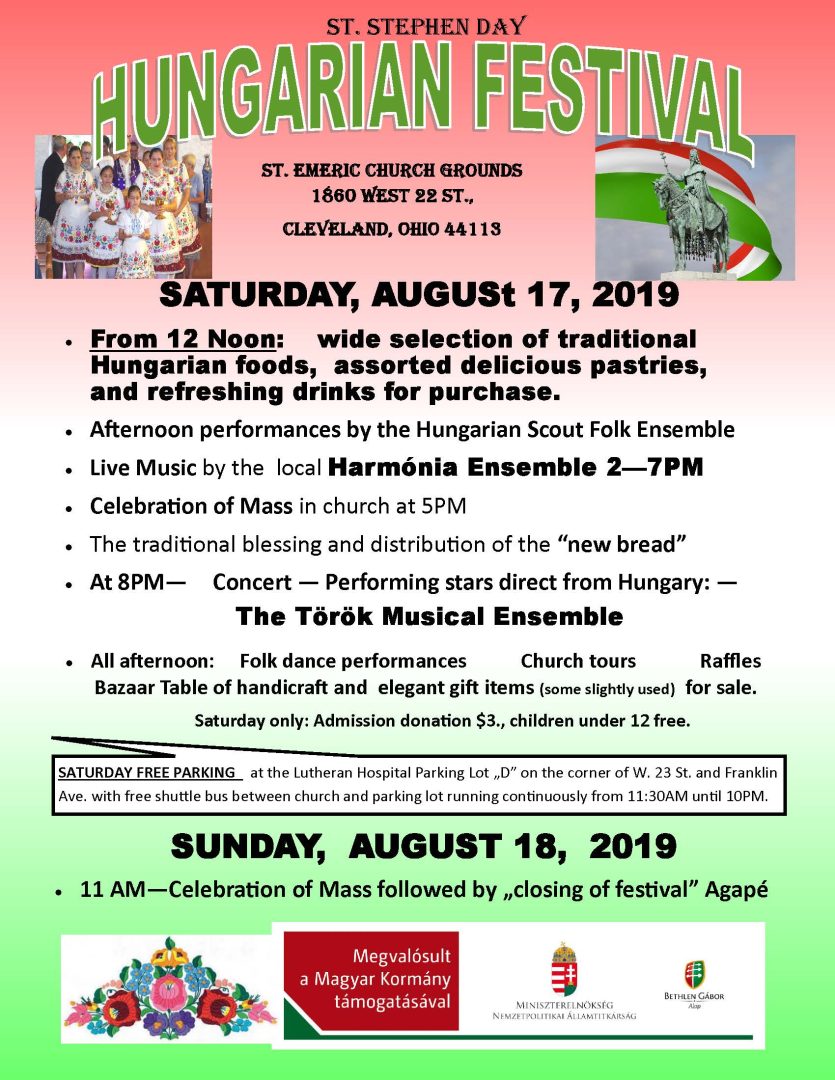 ST. STEPHEN DAY SATURDAY, AUGUST 17, 2019 ST. EMERIC CHURCH GROUNDS 1860 WEST 22 ST., CLEVELAND, OHIO 44113 • From 12 Noon : wide selection of traditional Hungarian foods, assorted delicious pastries, and refreshing drinks for purchase. • Afternoon performances by the Hungarian Scout Folk Ensemble • Live Music by the local Harmónia Ensemble 2 —7 PM • Celebration of Mass in church at 5PM • The traditional blessing and distribution of the “new bread” • At 8PM— Concert — Performing stars direct from Hungary: — The Török Musical Ensemble *************************************************